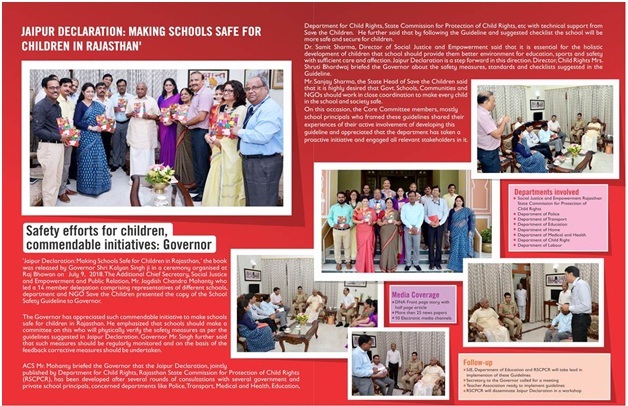 Jaipur Declaration: Guidelines and Checklist to Make Schools Safe for Children in Rajasthan has been released by His Highness Mr. Kalyan Singh ji, Hon’ble Governor, Rajasthan on 12th July 2018.